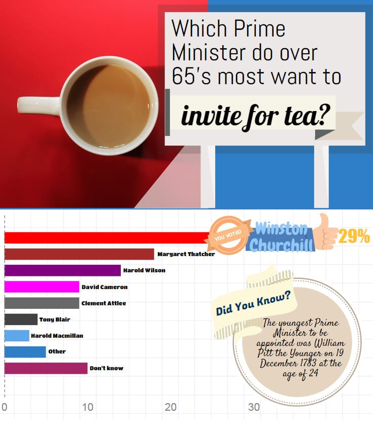 As part of our recent Stannah Silver Census Survey, we asked a group of Britain’s over 65s “If you had to choose, which one, if any, of the following Prime Ministers would you MOST like to have a cup of tea with”. The options varied from the recently re-elected Prime Minister David Cameron, to Iron Lady Margaret Thatcher and war hero Winston Churchill.